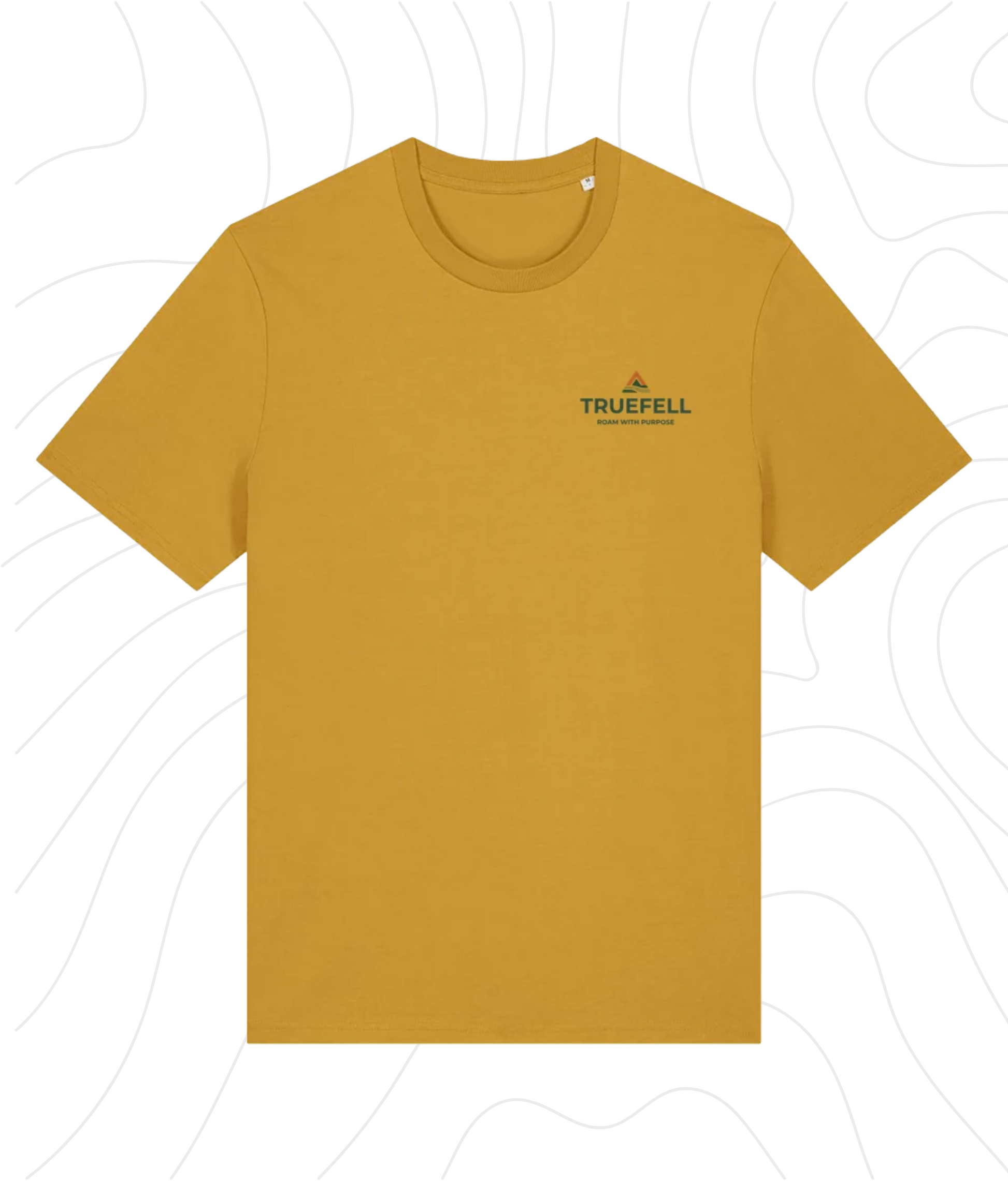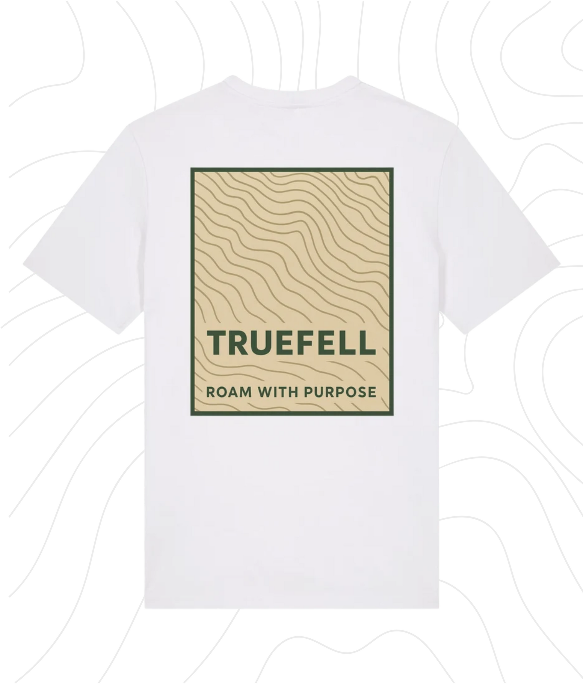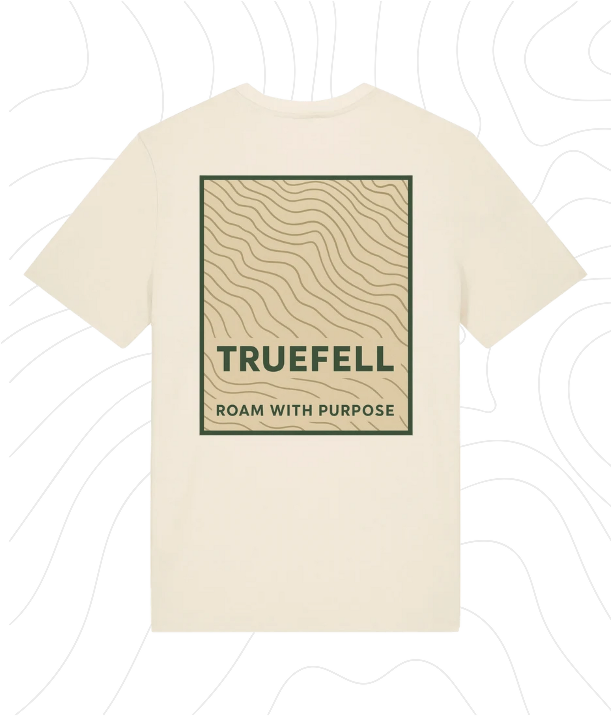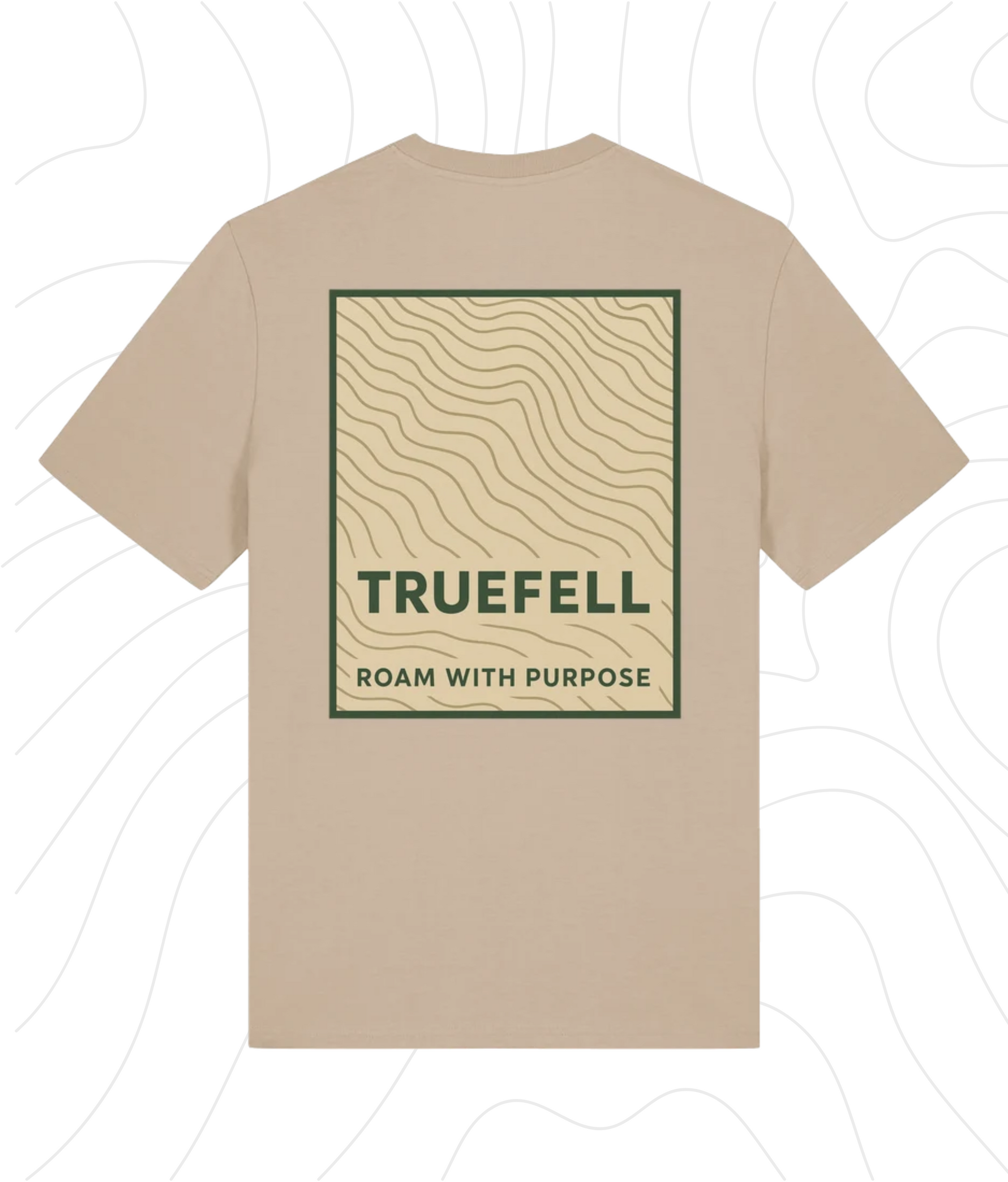 The Contour Forest T-Shirt features a full back print of hand-drawn contour lines in Earthstone Beige, framed in Forest Green and set with the TRUEFELL wordmark and guiding phrase: Roam with Purpose. On the chest, a trailhead triangle motif and wordmark sit in soft contrast rendered in White and Bracken Rust.