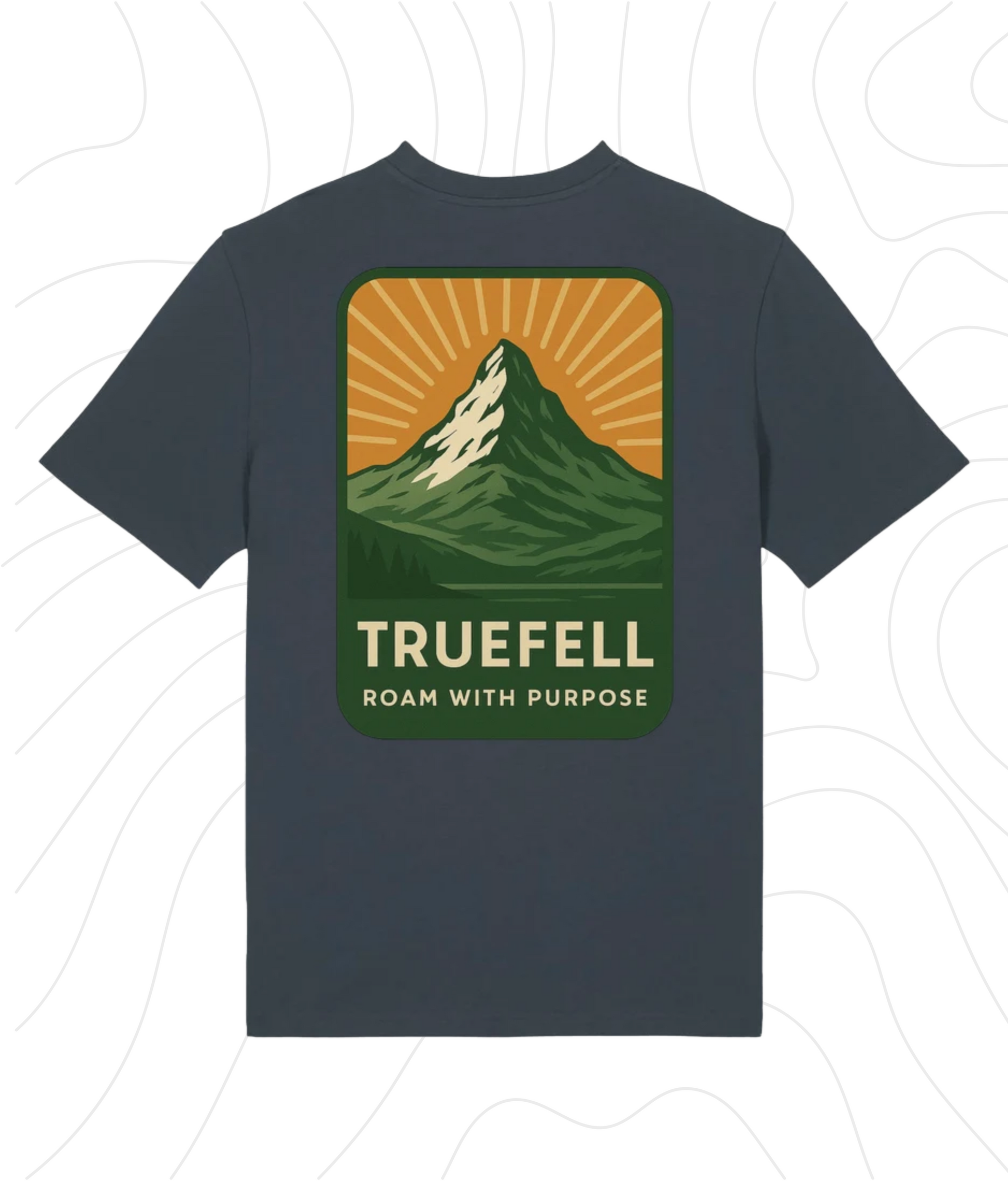 Back: Mountain badge with rising sun and TRUEFELL - Roam with Purpose
