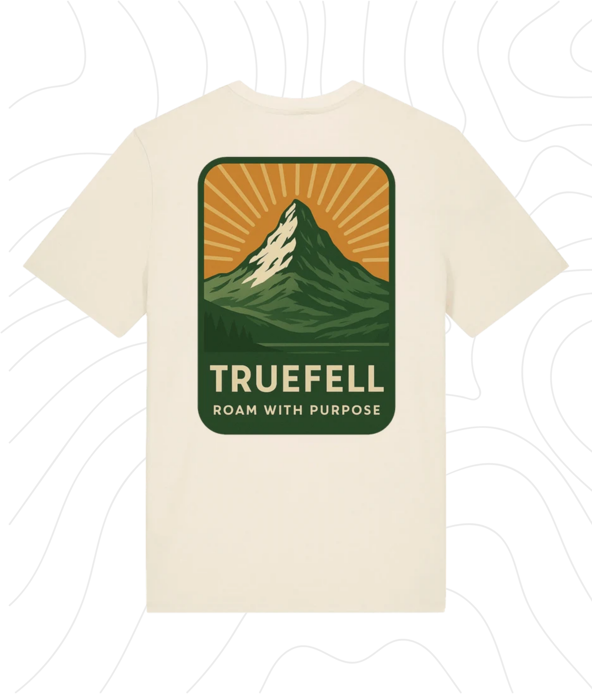 Back: Mountain badge with rising sun and TRUEFELL - Roam with Purpose