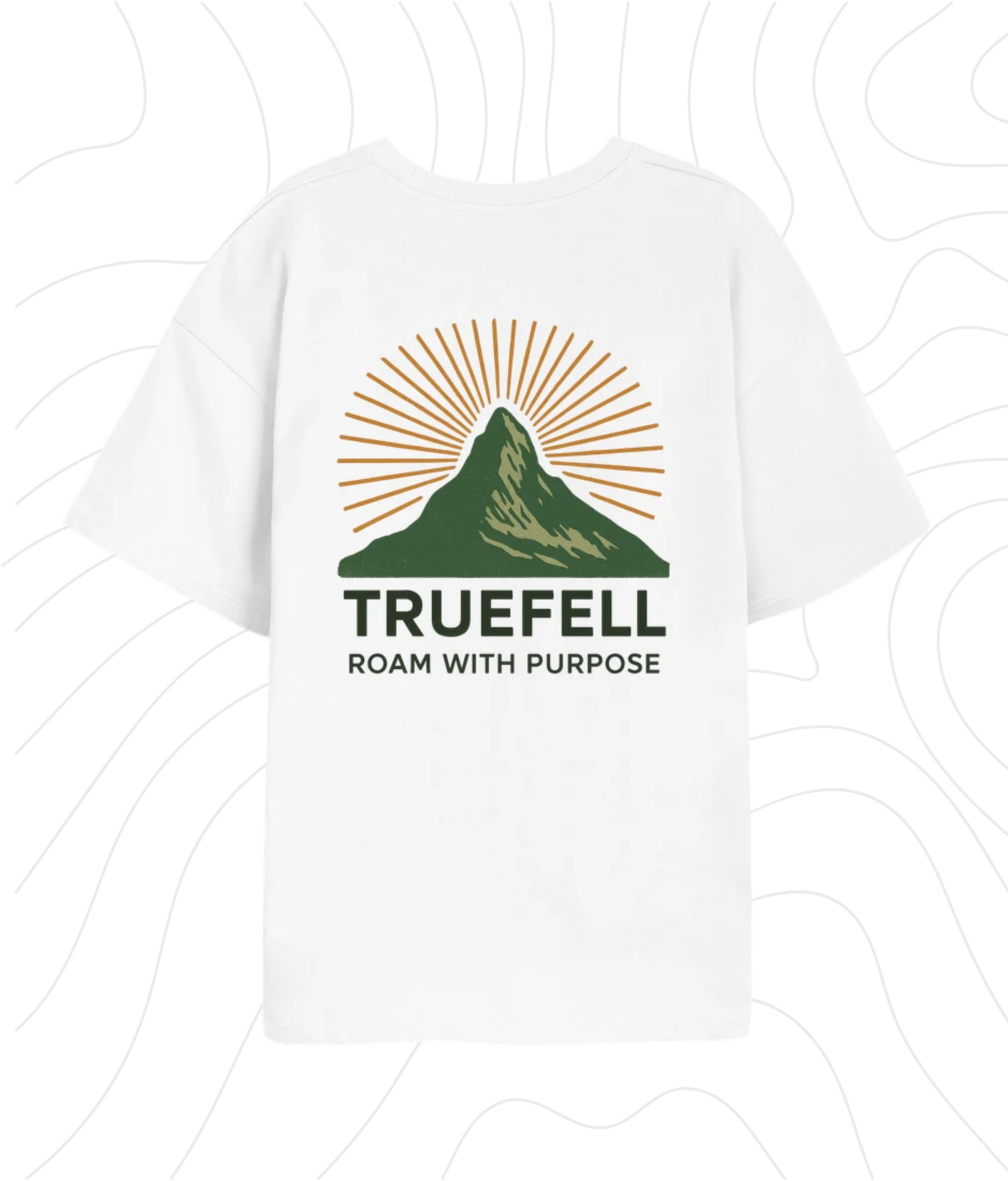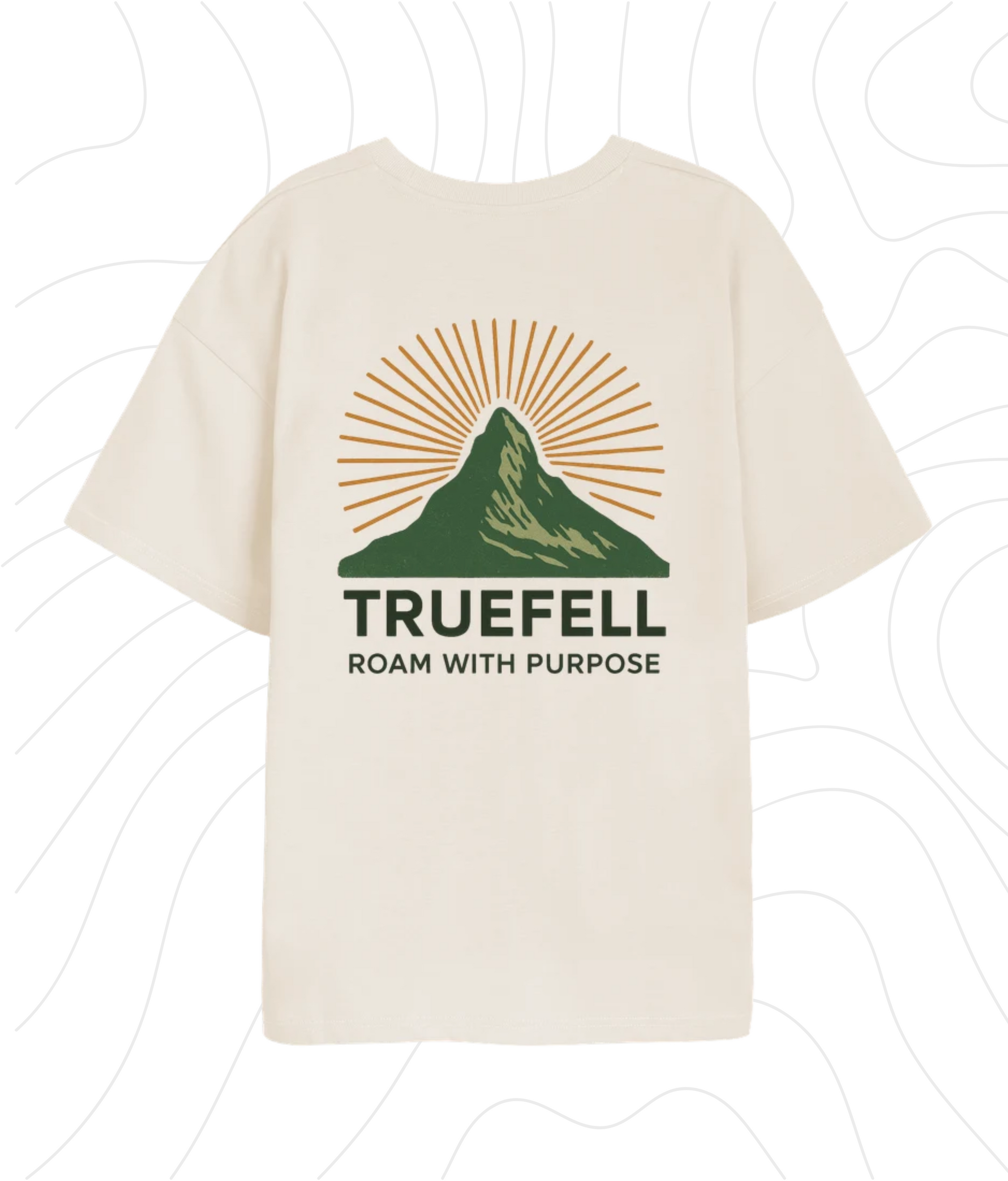 The Sunburst Oversized T-Shirt features the TRUEFELL mountain mark surrounded by rising rays a graphic that captures quiet elevation, still horizons, and purpose in motion. Printed large across the chest, it brings warmth and direction to a classic silhouette.