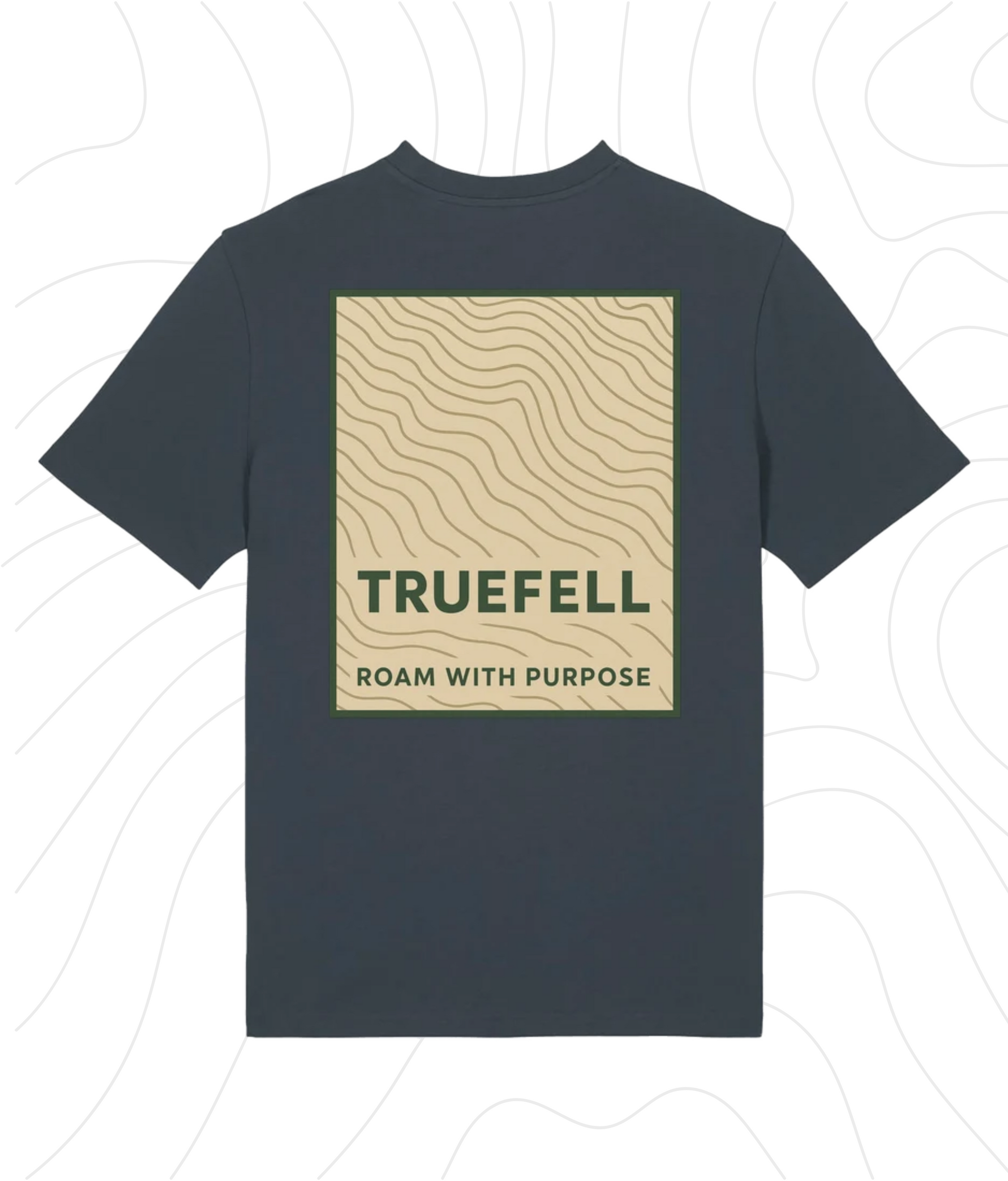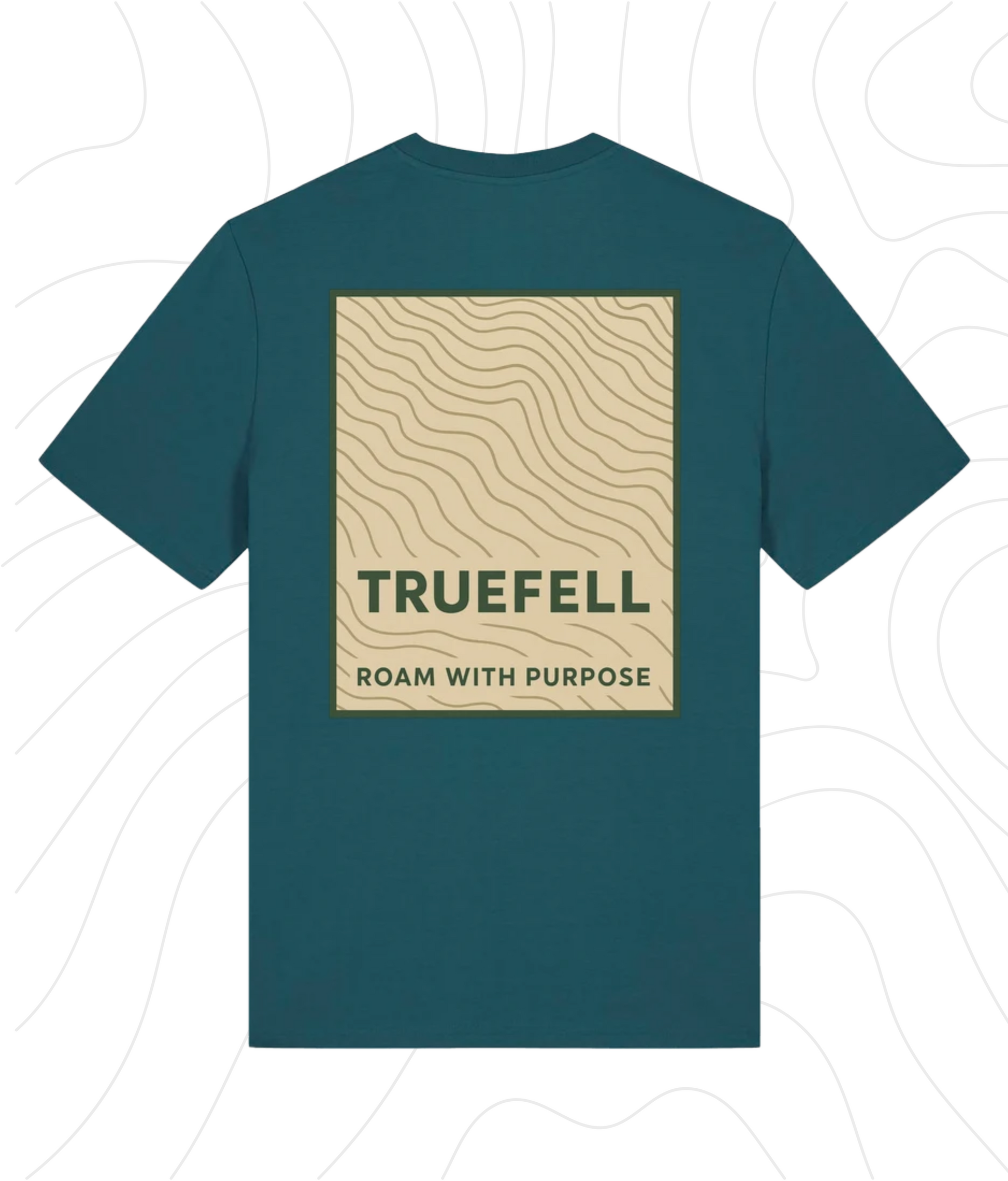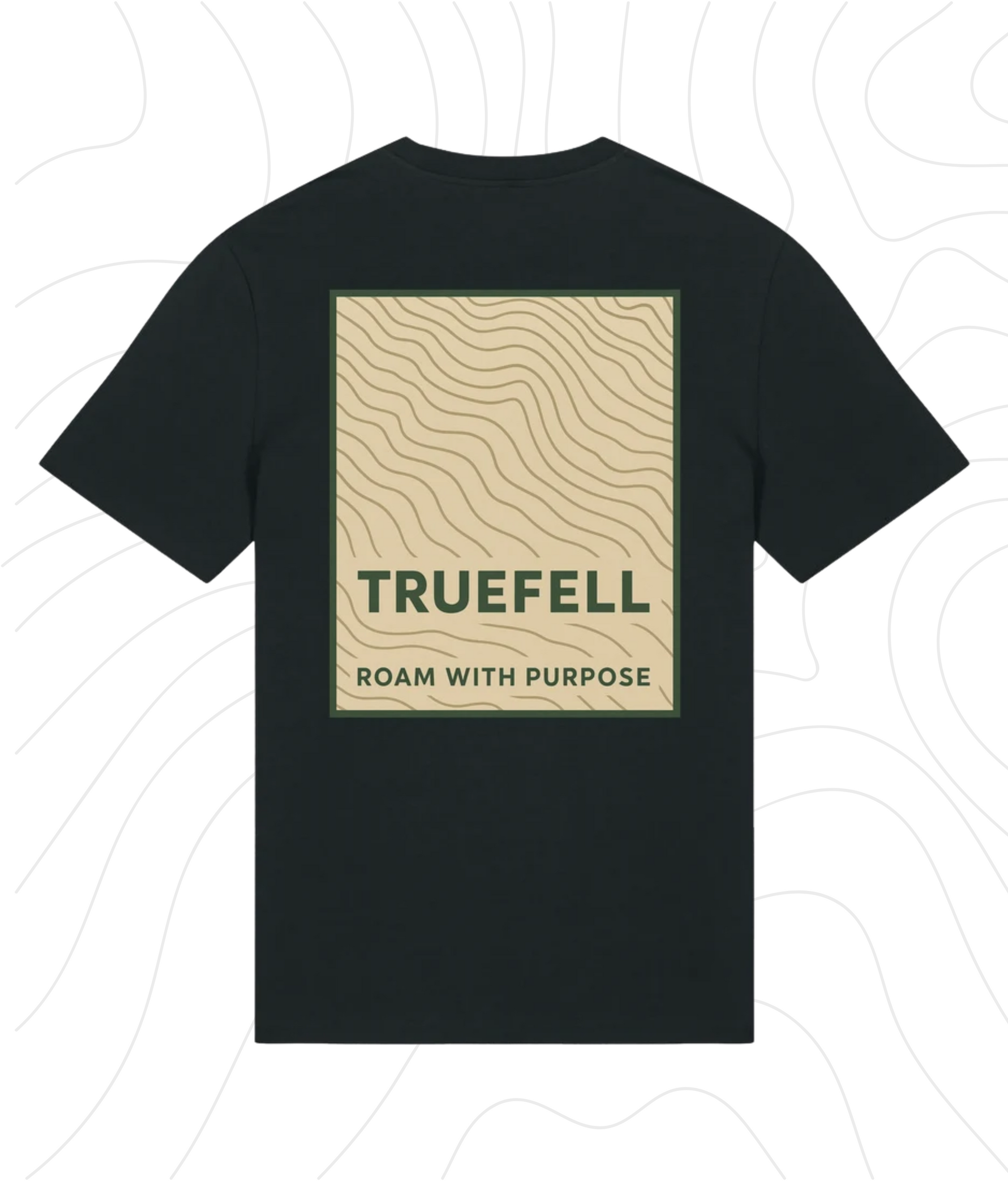 The Contour White T-Shirt features a full back print of hand-drawn contour lines in Earthstone Beige, framed in Forest Green and set with the TRUEFELL wordmark and guiding phrase: Roam with Purpose. On the chest, the trailhead triangle and brand logo appear in White and Bracken Rus designed for subtle clarity on deeper-toned cotton.