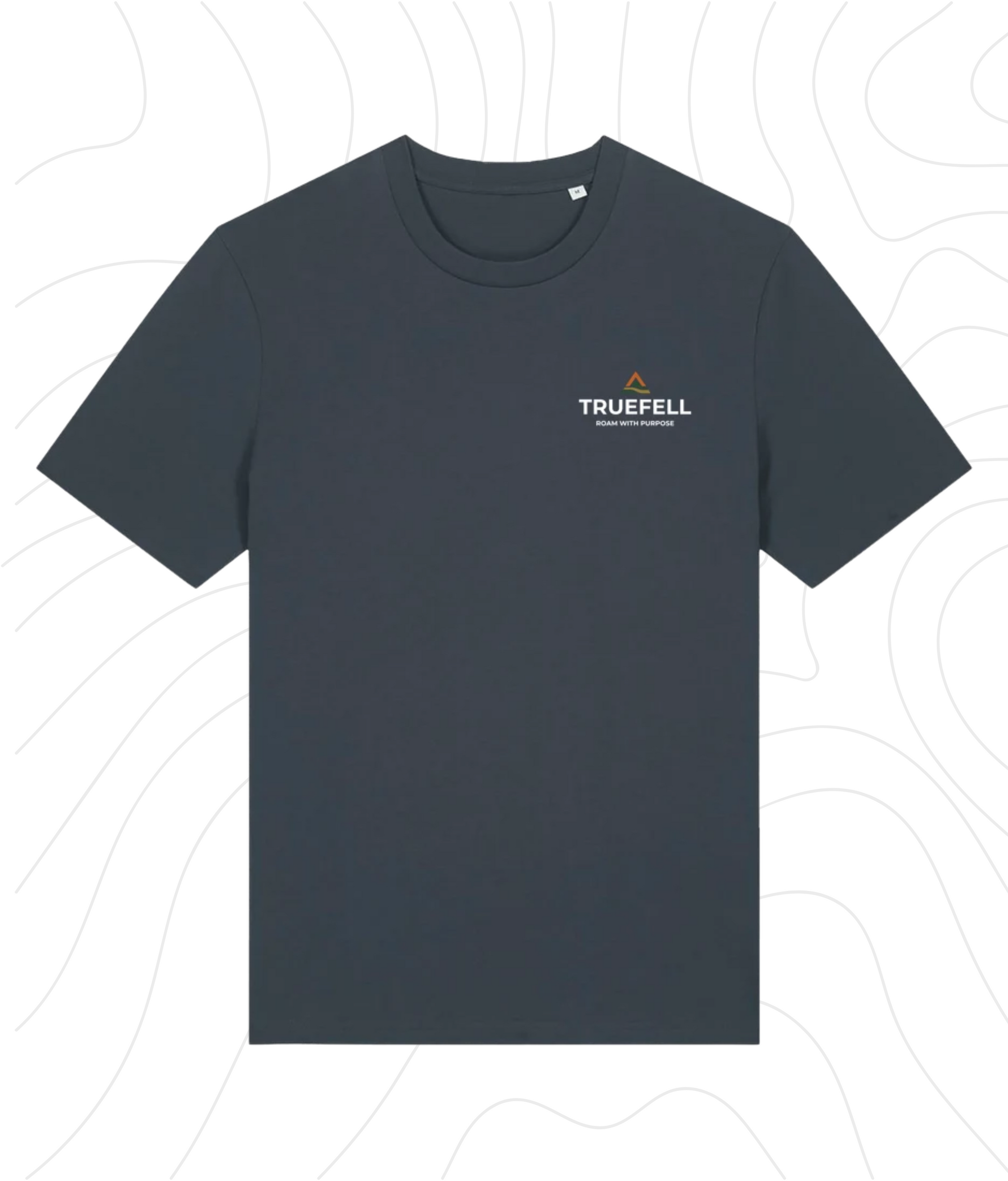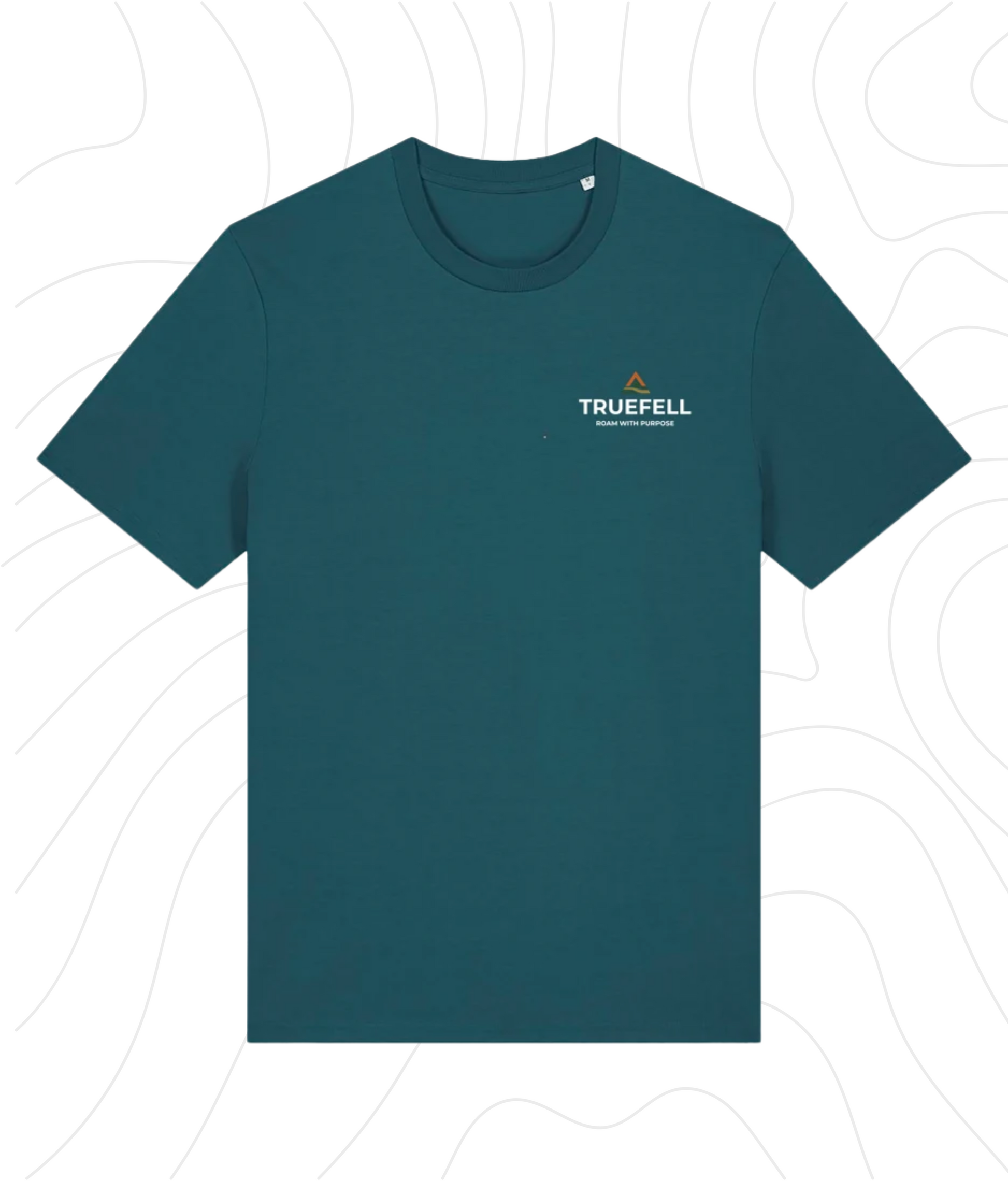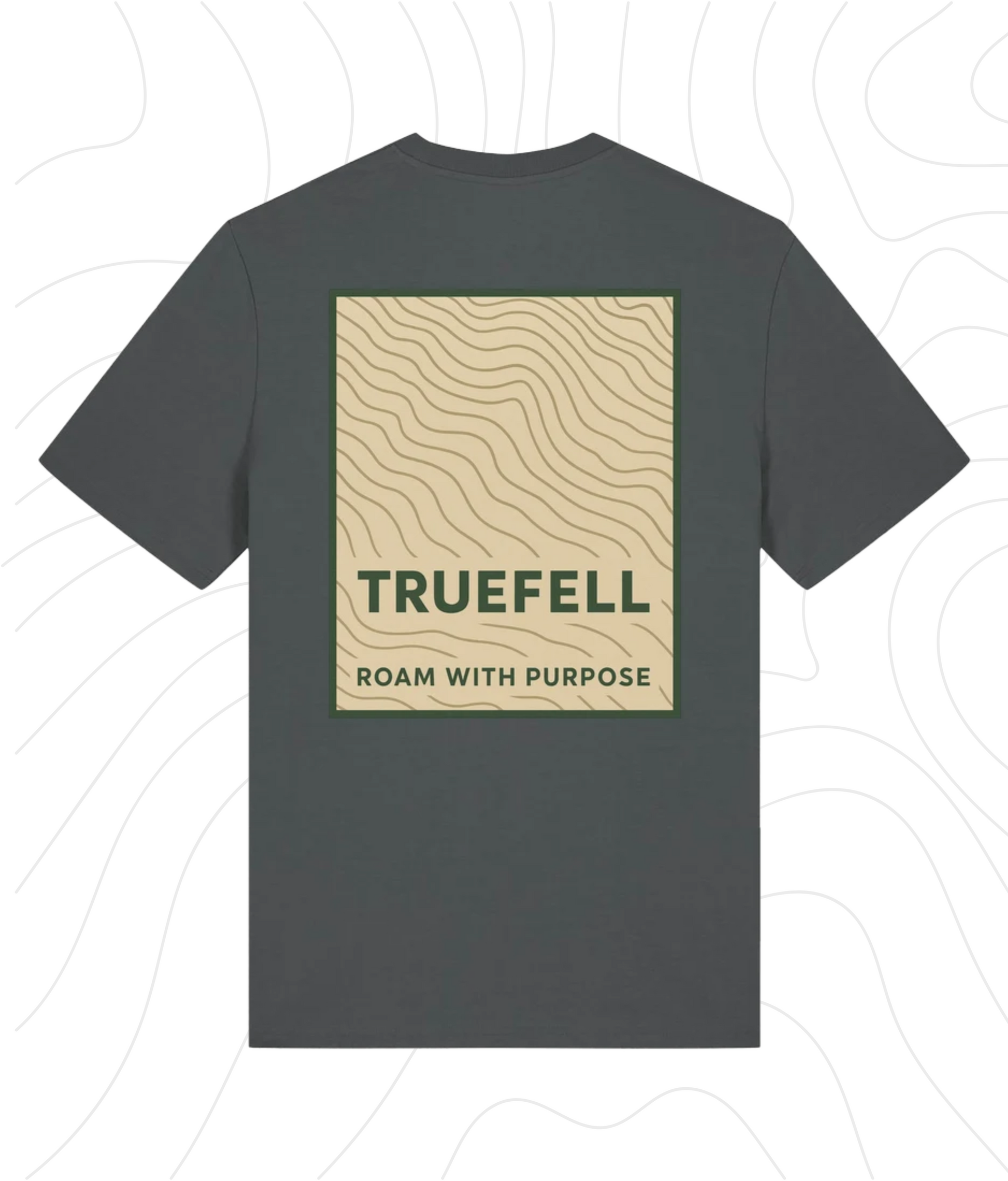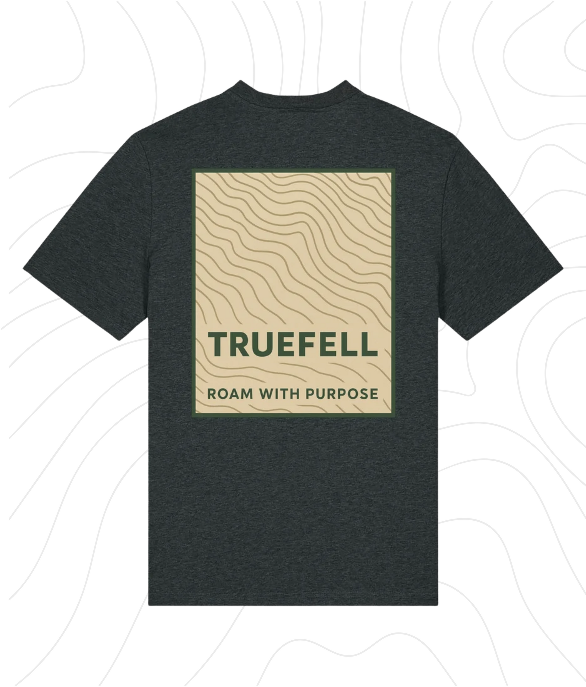 The Contour White T-Shirt features a full back print of hand-drawn contour lines in Earthstone Beige, framed in Forest Green and set with the TRUEFELL wordmark and guiding phrase: Roam with Purpose. On the chest, the trailhead triangle and brand logo appear in White and Bracken Rus designed for subtle clarity on deeper-toned cotton.
