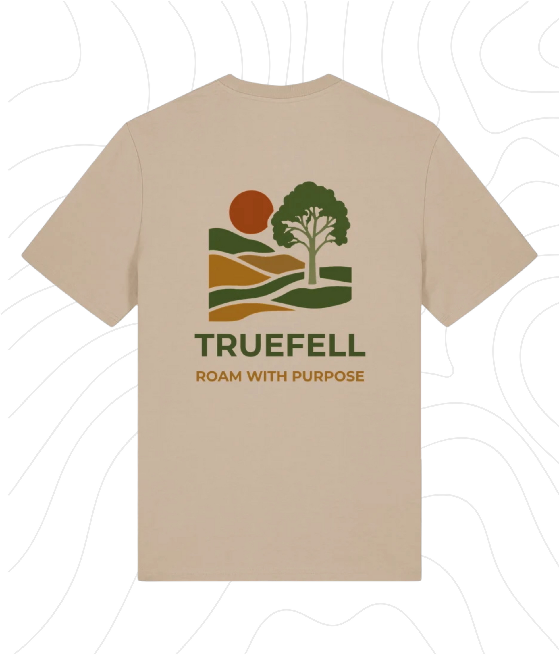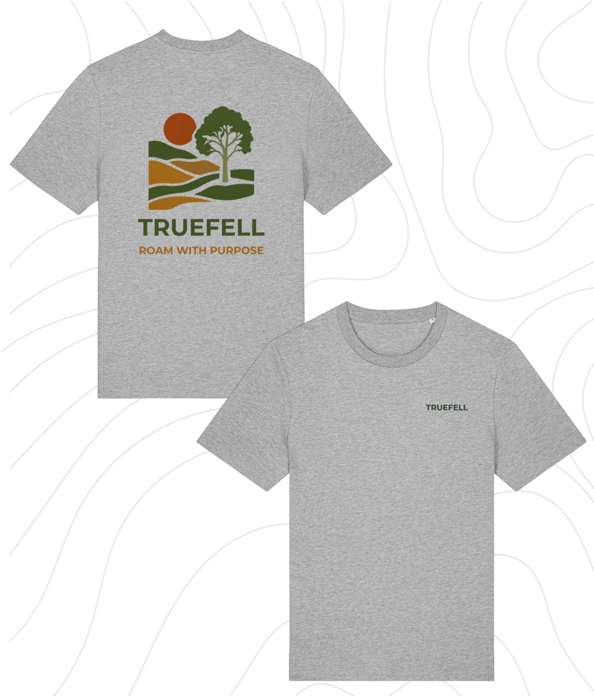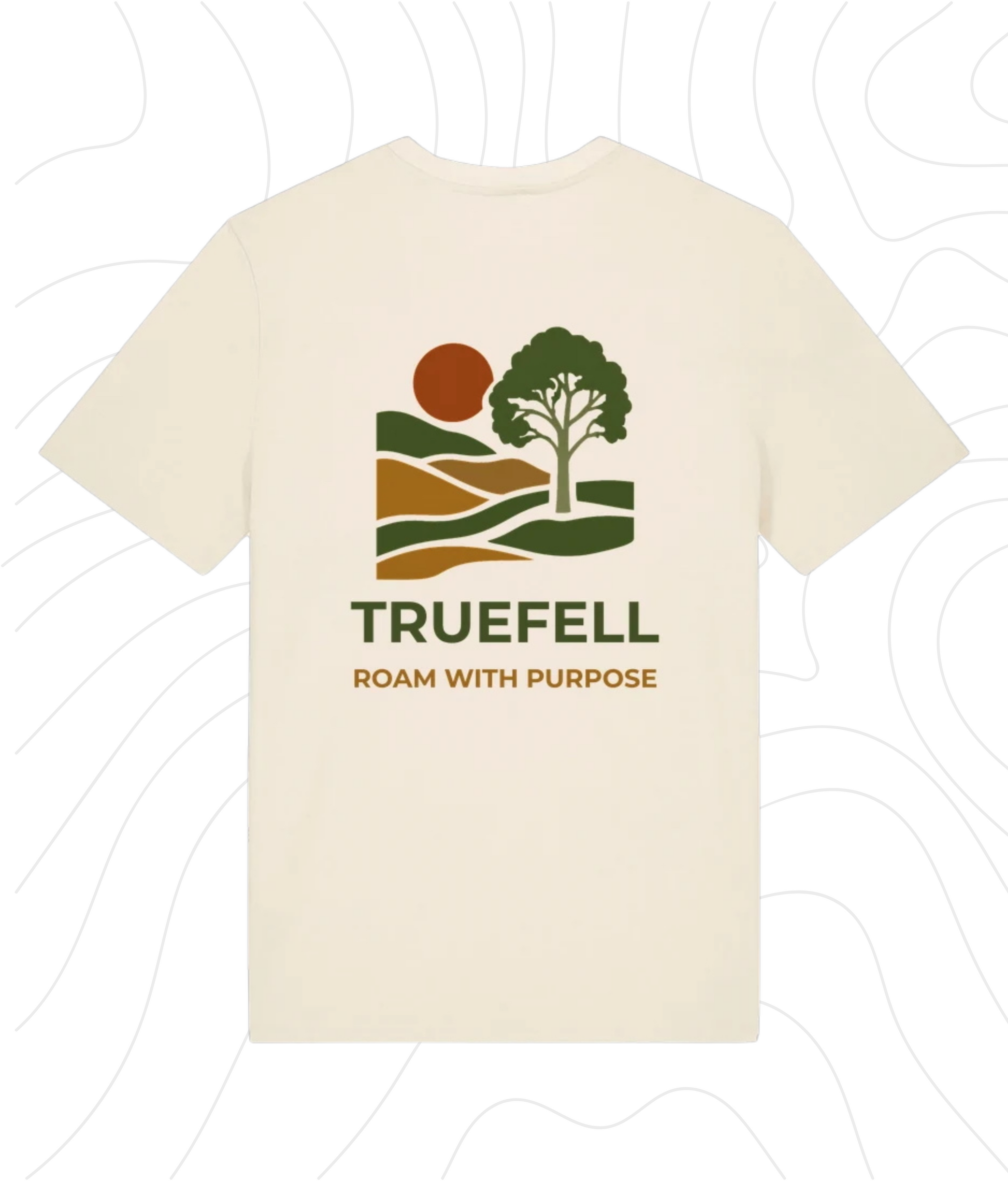 This edition features a bold back graphic inspired by quiet hillsides, still woodland, and the rising sun. Framed by the TRUEFELL wordmark and guiding phrase - Roam with Purpose - it reflects both where we walk and why we roam.