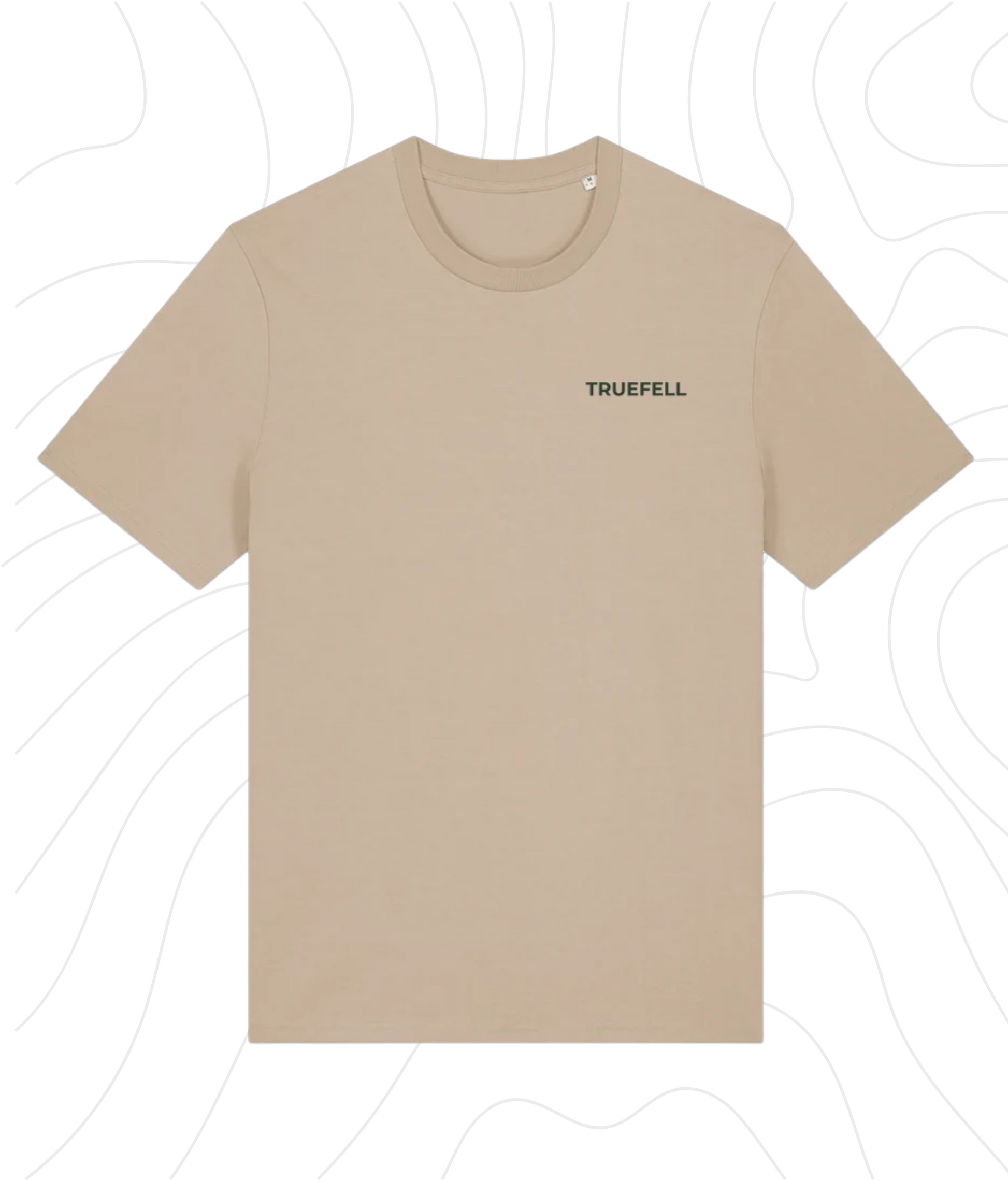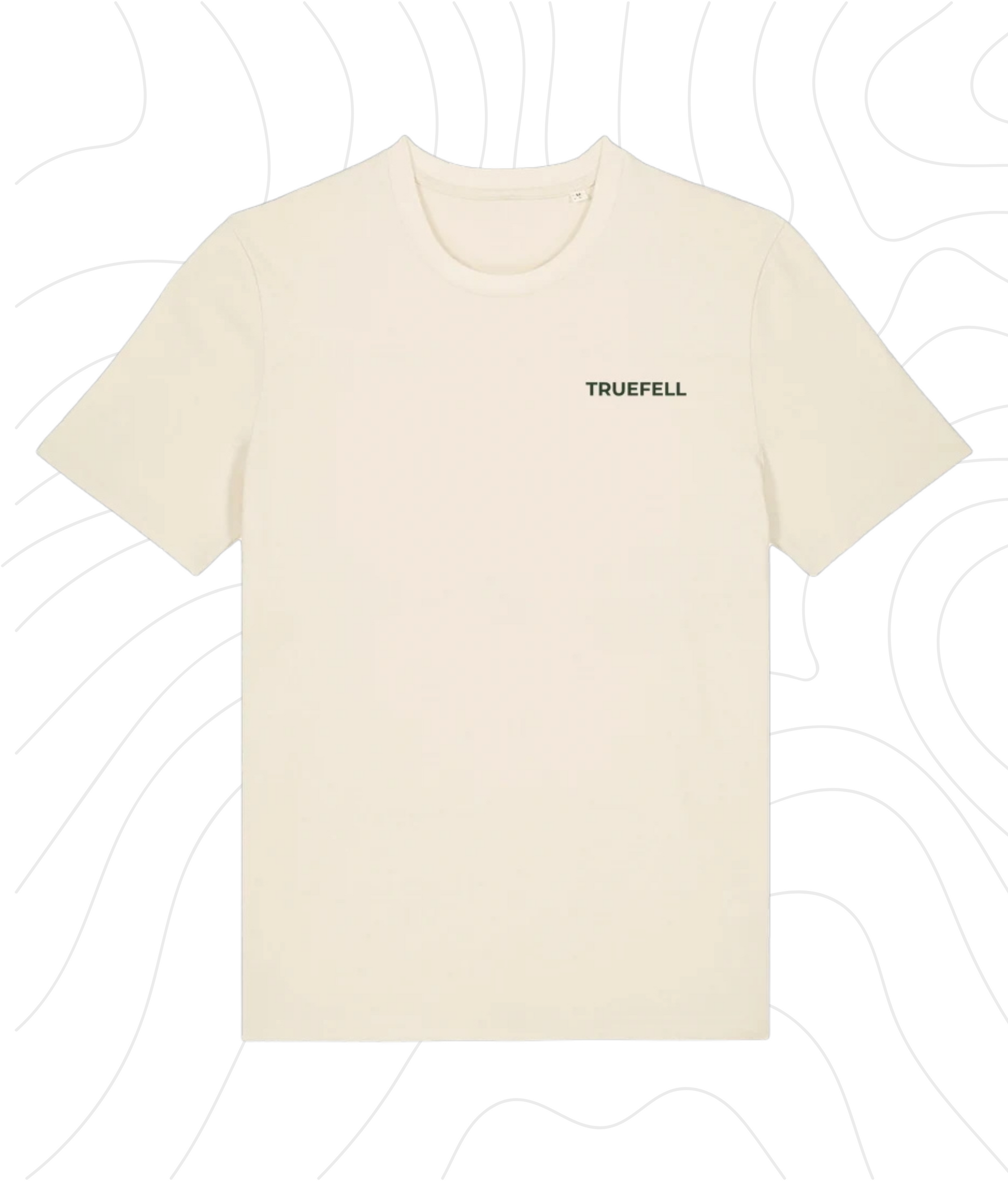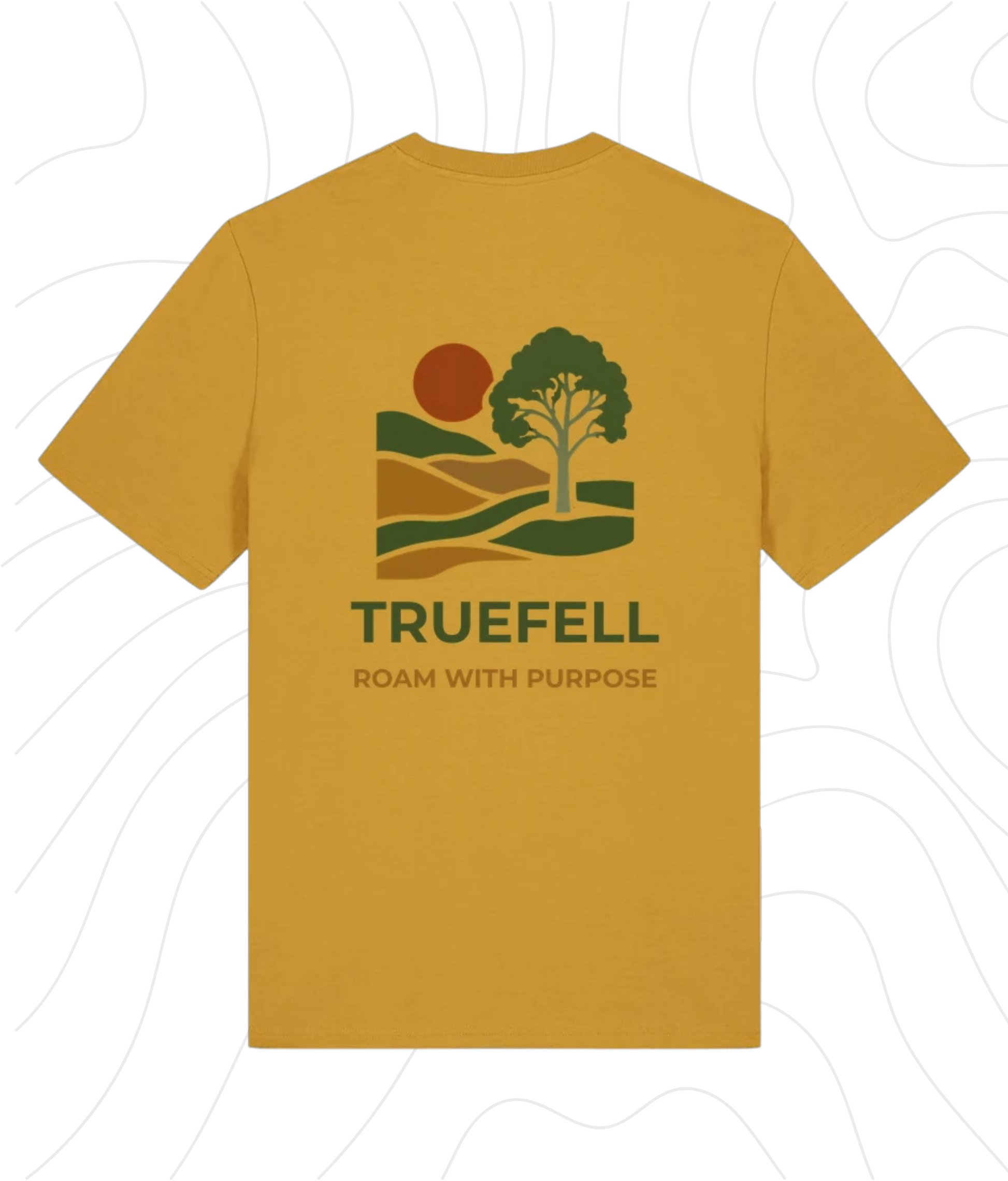 This edition features a bold back graphic inspired by quiet hillsides, still woodland, and the rising sun. Framed by the TRUEFELL wordmark and guiding phrase - Roam with Purpose - it reflects both where we walk and why we roam.