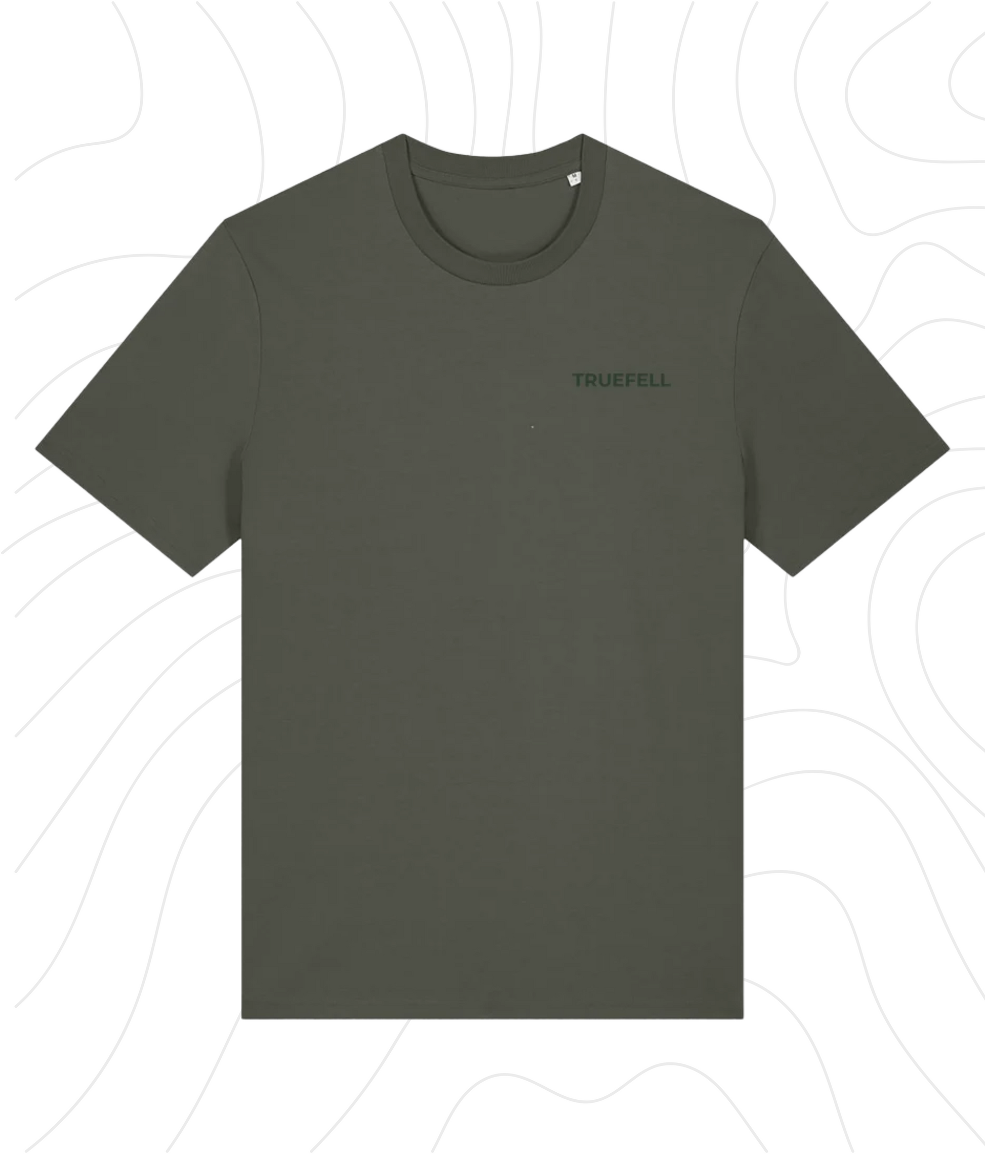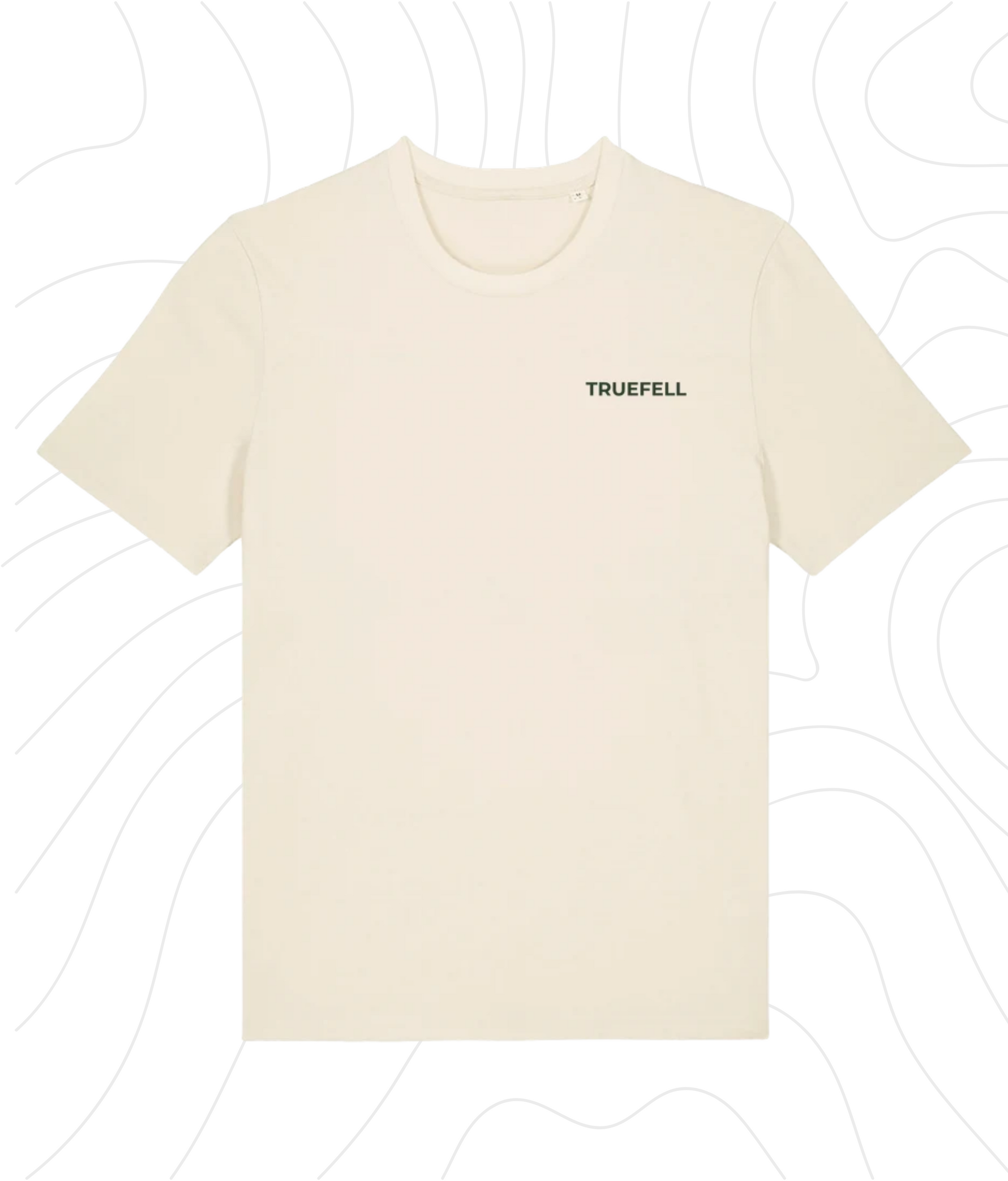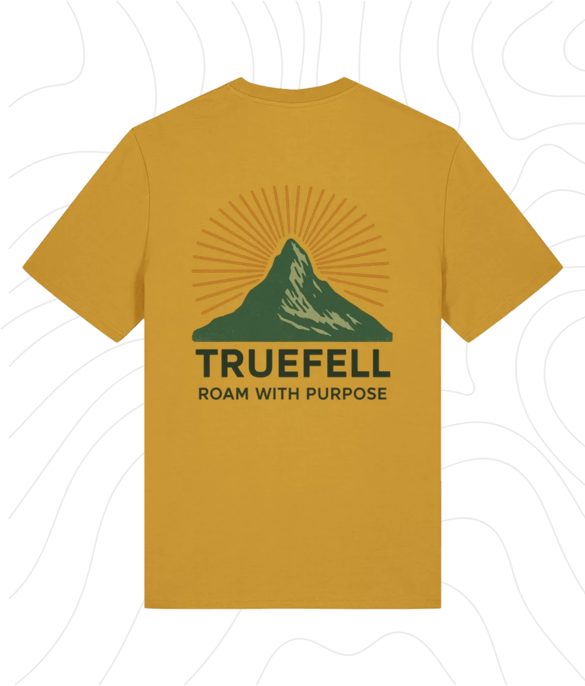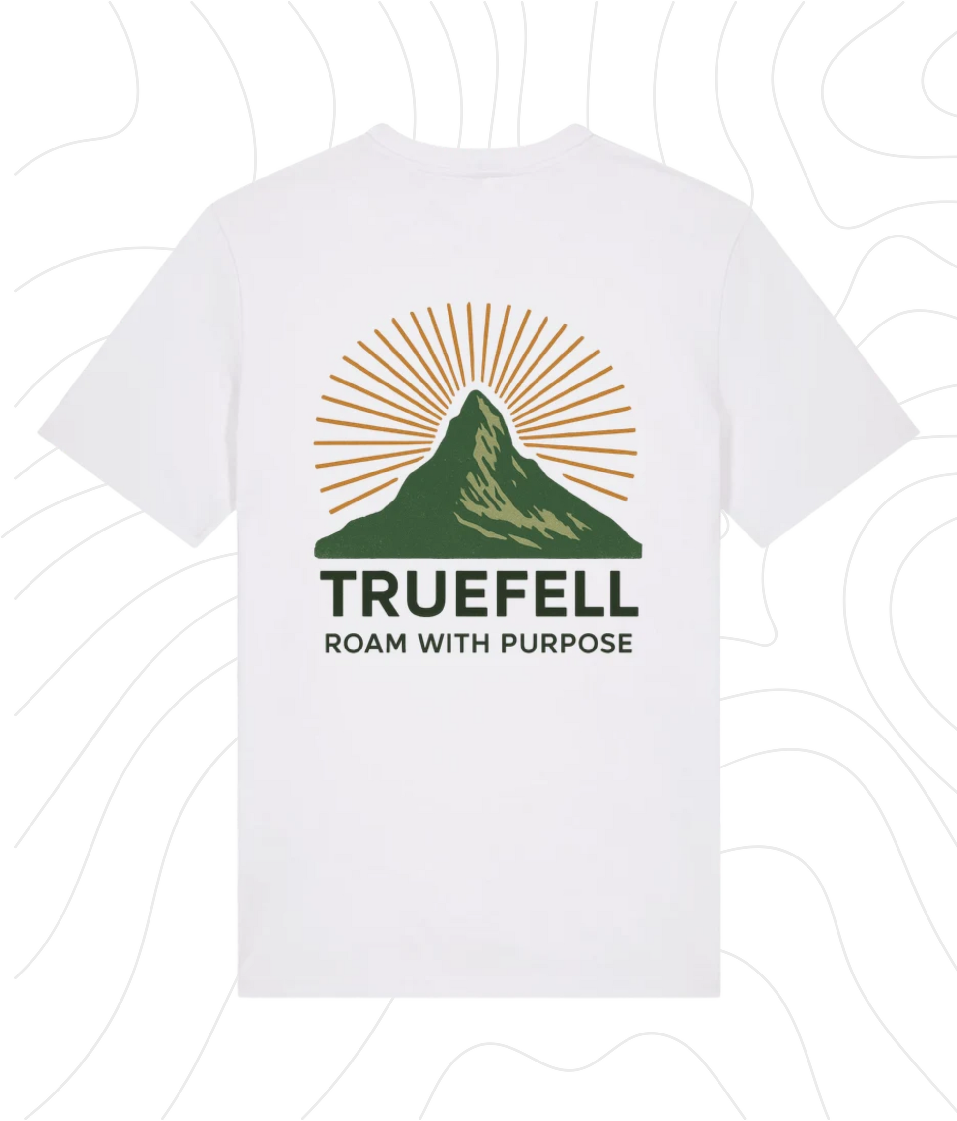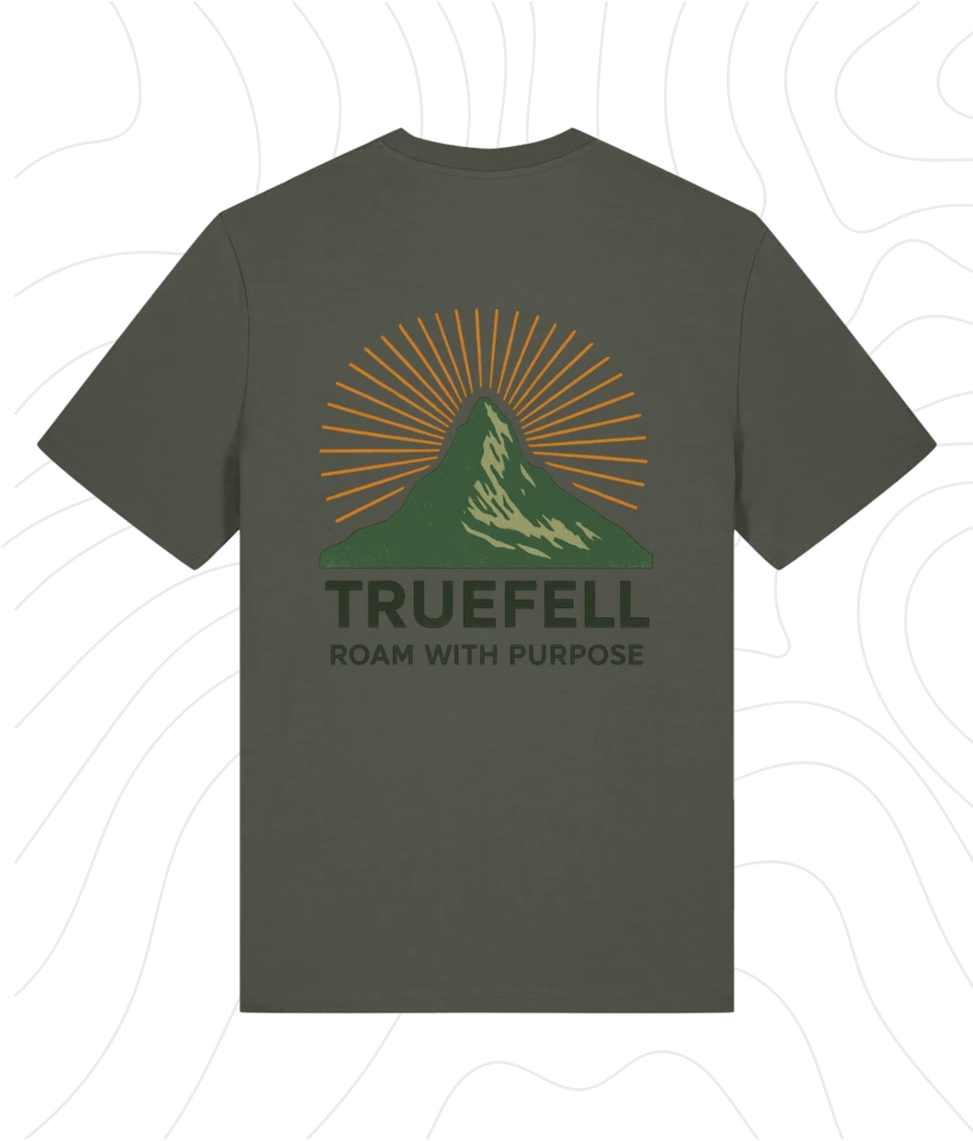 Inspired by early sun over ridgelines, The Sunburst T-Shirt features a bold back print of rising rays and layered peaks - framed by the TRUEFELL wordmark and the guiding phrase Roam with Purpose. On the front, a clean Forest Green logo grounds the piece in quiet strength.